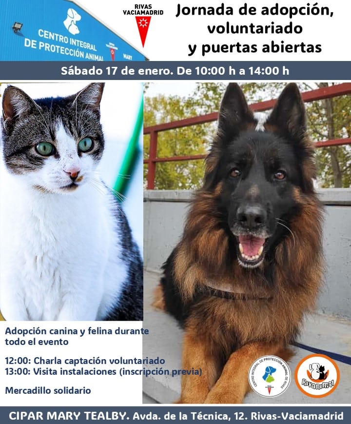 El sábado, entre las 10:00 y las 14:00, el CIPAR se abrirá para que todos aquellos interesados puedan acudir sin necesidad de cita previa. Durante la jornada se podrá ver a los perros y gatos que conviven en el centro con los voluntarios de Rivanimal y se podrá obtener información sobre los trámites necesarios para adoptarlos.